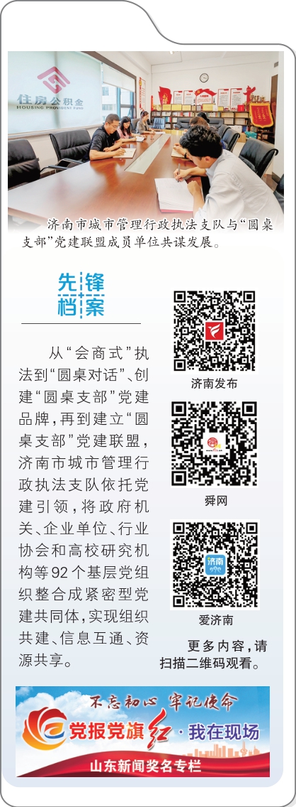 “圆桌对话”能解决多少问题?截至6月底,济南市城管部门关于项目施工、城市建设、环境整治等领域的各项投诉量大幅度下降。从“会商式”执法到“圆桌对话”、创建“圆桌支部”党建品牌,再到建立“圆桌支部”党建联盟,党建联盟的创建并非一蹴而就,而是一项长期、持久的工作。