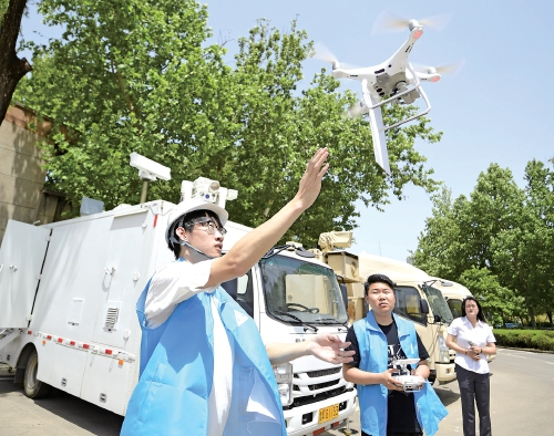 山东济钢空天产业发展有限公司工作人员展示要地净空防御系统对于非法无人机进行信号干预。