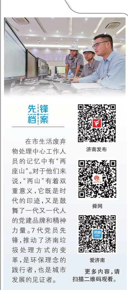 两座山不远处,紧邻的是一座现代化的垃圾焚烧处理厂。在这里,垃圾通过焚烧取热获得了价值。在垃圾焚烧发电的智慧化平台前,处理中心的党员正在指导业务;焚烧设备前,党员骨干实时观察着运行情况。他们始终坚守初心使命,保障民生环境卫生需求,为城市安全运行保驾护航……目前,济南的5个生活垃圾焚烧发电厂,每日可焚烧生活垃圾9000余吨,年发电量约10.8亿度。在运行现场,不同种类的垃圾,通过不同的处理方式,实现了减量化和资源化,曾经的负担,如今变成了资源。(本报记者 王飞 王永)
