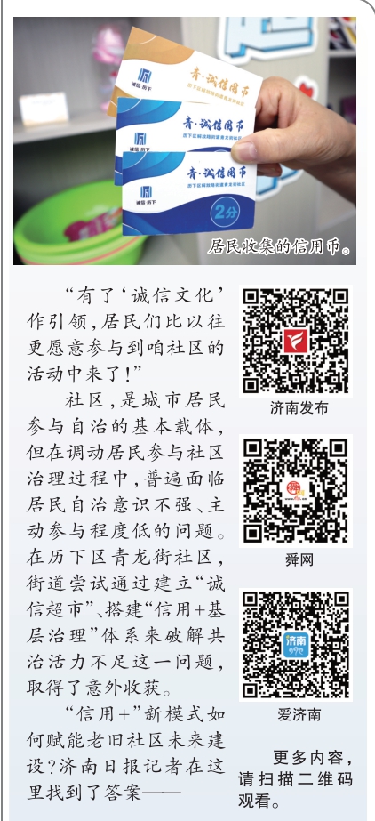 解放路街道是济南市首个诚信示范街道,从2019年以来,街道就一直致力于将诚信建设与基层治理各个环节深度融合,并在全市首创打造“信用+基层治理”新模式。今年,街道再度更新“信用+”模式,探索出“信用+积分兑换”的新应用场景,并在青龙街社区落地。