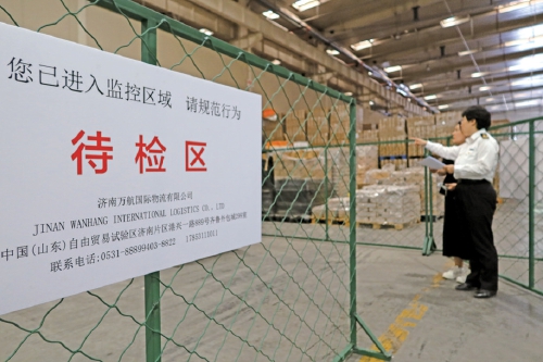泉城海关特殊区域监管二科副科长高璐正与同事检查待检区里的一批红酒。济南万航国际物流有限公司关务负责人刘丽莎说,这个“待检区”是在原有的“保税货区”和“完税货区”基础上增加的。