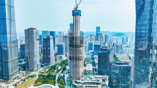 7月12日,在济南中央商务区复星国际金融中心项目建设现场,主塔办公1号楼的核心筒主体结构封顶,屋顶层正在进行顶板钢筋绑扎、安装预埋件施工,外框钢柱吊装到38-40层,钢筋桁架楼承板进入29层的铺装,楼承板混凝土浇筑至27层。