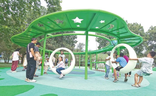 大明湖北岸,孩子们在儿童游乐区玩耍。记者近日来到大明湖西南门北侧区域,发现该区域铺设了数千平方米的草坪,修建了步行道,景区的视觉空间被“打通”,游客可以更好地欣赏“一城山色半城湖”的美景。此外,草坪东侧还新增了免费的“儿童游乐区”,整体色调以绿色为主,塑胶地面、秋千、滑梯、跷跷板、转椅、蹦蹦床等游乐设施一应俱全,为市民和游客提供了免费“遛娃”的好去处。 (本报记者 崔健 摄)