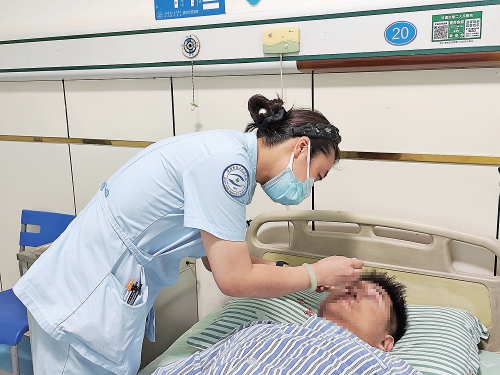 护士正在为患者韩凯做护理。
