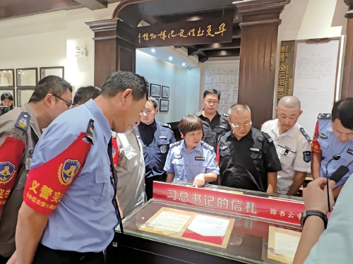 活动中,大观园派出所社区民警和义警队员参观了书信文化展,现场一枚枚邮票、一封封书信背后的故事,让大家深切感受到名人名家书信中透露出的家国情怀。