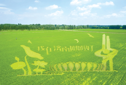 8月4日,在历城区荷花路街道苌家庄村的稻田里,巨幅的“稻田画”在村民们的栽种下已经显露雏形。站在稻田旁的高塔上凭高远眺,不同风格的“稻田画”尽收眼底。一幅以泉城元素为主,内容包括泉标、荷花、白鹭、奥体中心的造型图案及“我在济南刚刚好”的字样,另一幅则以新中国成立75周年为主题,包含数字“75”、五星红旗和天安门城楼的造型图案。据了解,“稻田画”的制作是采用GPS技术定位插竿、牵线、画轮廓,在相应的位置上种植不同品种的水稻,用以呈现出一幅幅栩栩如生的“稻田画”。随着水稻的不断成长,色调不断变化,待进入成熟期后,巨幅“稻田画”便被描绘出来,届时将成为泉城美丽乡村的一道亮丽景观。(本报记者 崔健 摄)