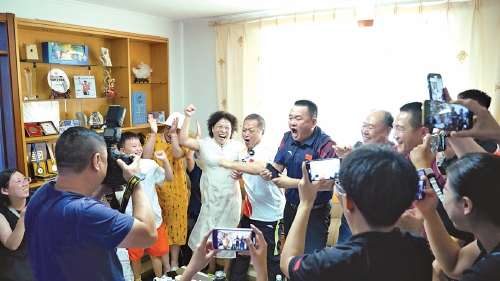 8月5日,李越宏的父母、爱人、儿子、启蒙教练及亲朋好友庆祝胜利。 (本报记者 王刚 摄)