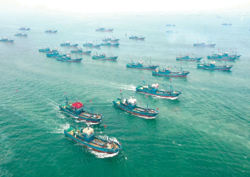 9月1日,在山东省荣成市石岛渔港,渔船出海驶向秋季捕捞作业海域(无人机照片)。当日12时,为期4个月的黄渤海伏季休渔期结束,所涉渔区迎来“开海”,各渔港码头渔船出海进行捕捞作业。 (新华社发)