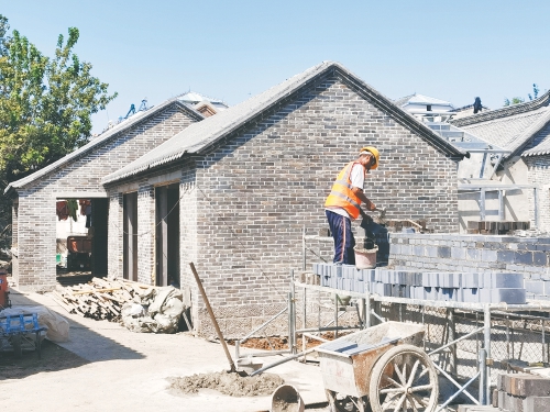 9月3日,在西更道街北首,1号院和南侧相邻院落的原有居民自建房拆除后,施工人员在原址新建了青砖灰瓦的仿古建筑,并将对老门楼进行改建。据了解,这处院落是清末著名小说家刘鹗的名作《老残游记》中写到的“高升店”,也是刘鹗曾经居住过的地方。按照济南古城(明府城片区)城市更新项目的规划,作为一处重要节点,该项目占地面积1273平方米,计划将原有泉渠打通改造,使其成为一处景观融入改造后的仿古院落,再现老济南家家泉水、青砖黛瓦的历史风貌。(本报记者 崔健 摄)