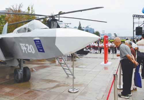 9月5日,市民在泉城广场参观海、陆、空武器军事装备模型。山东舰、武直十、歼-20战斗机、99A主战坦克、中国空间站、“玉兔号”月球车、长征系列运载火箭等模型悉数登场。 (本报记者 崔健 摄)
