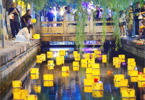 9月6日,市民游客在曲水亭街泉渠点亮荷灯,探访名泉,体验泉水奇妙夜。