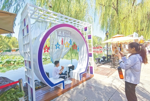 9月6日,市民在济南百花洲历史文化街区拍照打卡。近期,百花洲历史文化街区的湖畔新添了多处富有泉城元素的打卡拍照点,不仅有荷花、荷叶造型相伴,还有多处“我爱济南”的心形造型及复古气息的拱形门和花瓣窗,在中秋节和国庆节前夕,为市民和游客营造了更加浪漫时尚的氛围。(本报记者 崔健 摄)