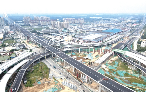 据了解,济南零点立交改造后为涡轮型枢纽互通,主线设置为济广高速主线桥和黄河南岸主线桥,共设置14条匝道,项目建成后将实现高速公路、城市快速路和城市主干路之间的交通转换,有效解决城市立交出入口常见的车辆交织问题。(本报记者 崔健 摄)