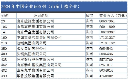 9月11日,中国企业联合会、中国企业家协会发布“2024年中国企业500强”,其中,山东有55家企业上榜,数量仅次于北京,位居全国第二。济南上榜企业有11家,有2家为民营企业。