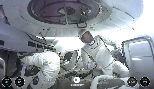 这张美国太空探索技术公司的视频截图显示的是,美国东部时间9月12日,“龙”飞船的机组成员准备出舱活动。