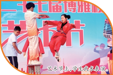 为丰富学生校园生活,校长潘云虹提出“快乐周三”的概念,鼓励学生积极参加社团活动。学生们可以根据自己的兴趣自主选择,“博雅星”合唱团、青春飞扬舞团、墨缘书法社等深受学生们的喜爱,每周的社团活动座无虚席。除此之外,学校还组织开设了数学大冒险、趣味英语、谈古论今、创意绘画、奇趣生物等活动课,在日常教学中提升学生综合素养,促进学生个性化发展。