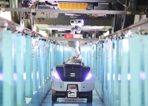 9月14日,在济南轨交2号线王府庄车辆段,一台“列车智能巡检机器人”正在自主对地铁列车进行全面检测。这台“列车智能巡检机器人”具有自动避障功能,通过高精度导航系统自主移动进入作业股道,灵活的多自由度机械臂上有一双萌萌的“大眼睛”,可任意伸展到需要检测的位置,覆盖车底、车侧大部分关键零部件,利用机器视觉技术、多种控制技术和先进算法,对指定列车转向架、车钩等关键部件进行图像采集,通过图像进行故障判断及磨耗预警,可大大提高检修效率,异物检测准确率达到95%以上。若发现异常,还可生成异常警报,传输到后台控制系统,帮助检修人员制定更加优化的解决方案。