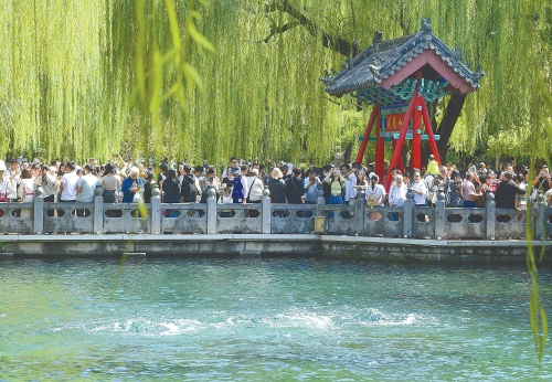 中秋假期第一天,秋高气爽,趵突泉公园、环城公园、五龙潭公园等游人如织,清澈的泉水搭配丝丝细柳,人们仿佛行走在画卷之中。当日,趵突泉水位再创新高,达到29.04米,“三股水”喷涌更加欢腾;五龙潭公园的月牙泉水流也愈发明显,久违的“月牙飞瀑”景观让市民游客大饱眼福。(本报记者 崔健 摄)