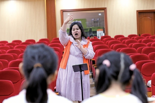 山东艺术学院“三下乡”支教志愿者,音乐学专业大二学生纪梵茜带领小学生排练合唱《老师》。