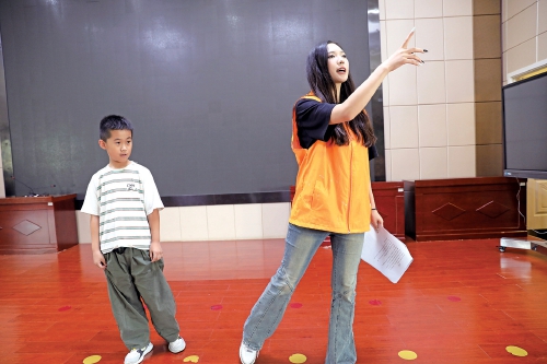 戏剧专业大二学生王艺彤在给小学生做示范,指导他们排练话剧《一封鸡毛信》。