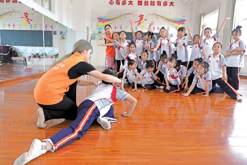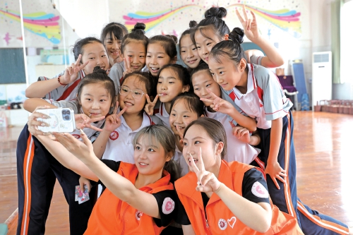 济宁市泗水县洙泗小学舞蹈排练教室,山东艺术学院舞蹈专业大二学生霍佳慧(前左)、刘骁萱(前右)与小学生自拍合影,记录她们的共同成长。