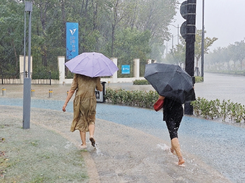 下图:9月16日,行人在上海临港新片区涉水前行。 (新华社发)