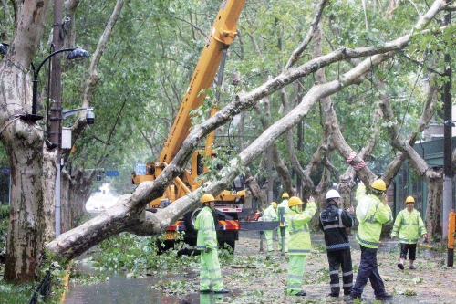 右图:9月16日,维护人员在处理倒在上海衡山路的树木。