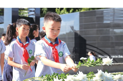 9月18日,小学生在侵华日军南京大屠杀遇难同胞纪念馆献花。