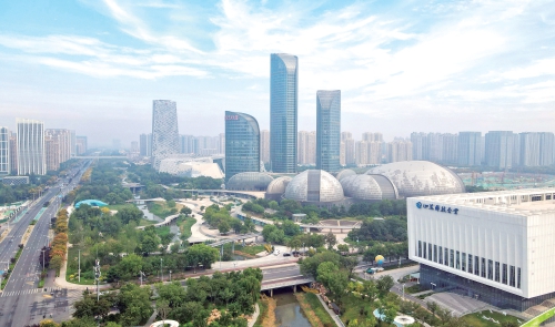 9月18日上午,济南西部城区上空白云似锦绸,白云下高楼林立,腊山河及周边景观如同一条玉带镶嵌在城市之中。