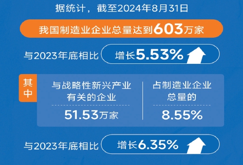 据统计,截至2024年8月31日,我国制造业企业总量达到603万家,与2023年底相比增长5.53%,其中与战略性新兴产业有关的企业51.53万家,占制造业企业总量的8.55%,与2023年底相比增长6.35%。