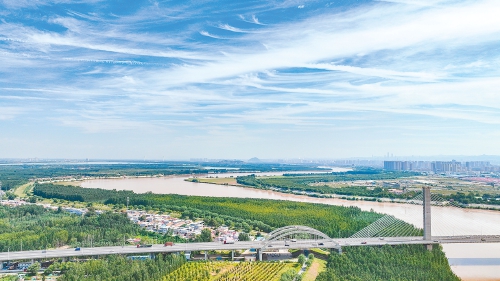9月23日,济南天气晴好,秋高气爽。从黄河北岸远眺,湛蓝的天空飘浮着缕缕条状云彩,有些是自然形成的,有些是飞机飞过之后留下的痕迹,蜿蜒的黄河与白云相映成趣,构成一幅美不胜收的秋日画卷。 (王锋 摄)