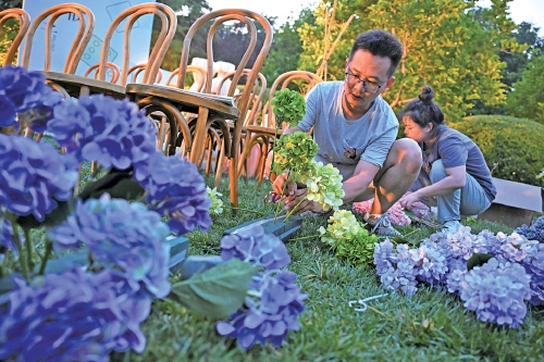 郝金伟和伙伴们一起为婚礼布置花艺。