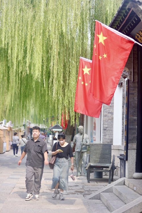 百花洲国旗飘扬,“中国红”成为老街最美丽的风景。一面面鲜艳的五星红旗扮靓老街,营造出“家家户户挂国旗,欢欢喜喜迎国庆”的浓厚氛围。(本报记者 赵晓明 摄)