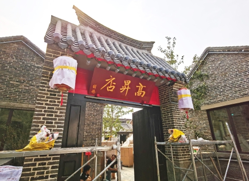 9月27日,济南西更道街北首1号院和南侧相邻院落的改建接近尾声,施工人员在原址新建了青砖灰瓦的仿古建筑。在新建仿古门楼上方,一块写有“高升店”的匾额已经悬挂起来。据了解,这处院落便是清末著名小说家刘鹗名作《老残游记》中写到的“高升店”,也是刘鹗曾经居住过的地方。按照济南古城(明府城片区)城市更新项目的规划,作为一处重要节点,该项目占地面积1273平方米,计划将原有泉渠打通改造,使其成为一处景观融入改造后的仿古院落,再现老济南家家泉水、青砖黛瓦的历史风貌。(本报记者崔健 摄)