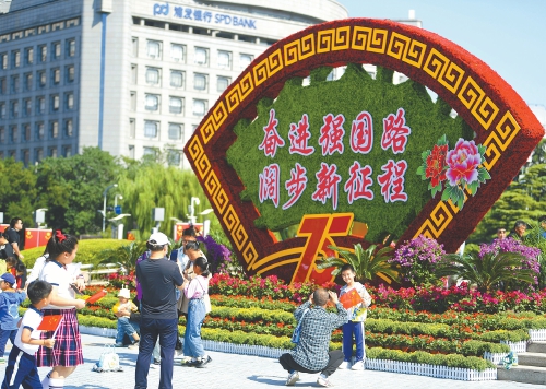 10月1日,市民游客在泉城广场游玩,享受国庆假期。当日是国庆假期首日,济南天气秋高气爽,人们出游热情高涨。在泉城广场,游客们挥舞着手中鲜艳的国旗,尽情享受着国庆假期的休闲时光。 (本报记者 崔健 摄)