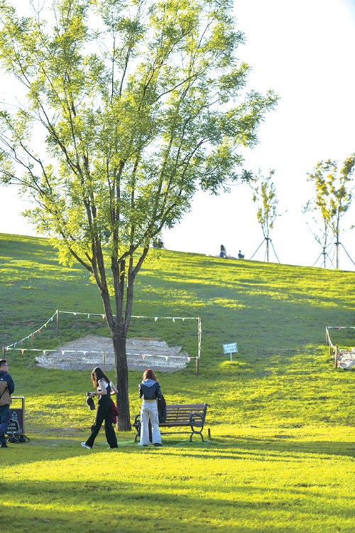 国庆假期,泉城持续晴好天气,齐鲁软件园旁边的菠萝山共享绿地被称为“济南版阿勒泰”,也有着宫崎骏动漫同款“云上草原”,湛蓝的天空下绿草如茵,远方高耸的城市建筑群,在光影错落中建构出立体的治愈画卷。众多市民和游客漫步在宽阔平坦的草坪上,感受大自然的拥抱,仿佛置身于辽阔的草原之中,在热闹的假期中感受诗意美景。 (王锋 摄)