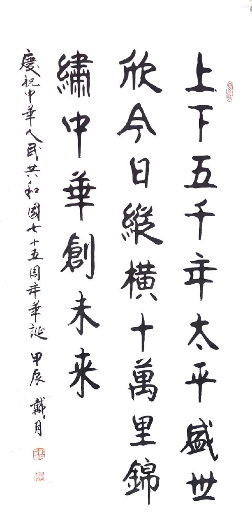 编者按 在这个世界瞩目的辉煌历史时刻,我们迎来新中国成立75周年。75载风雨兼程,75年砥砺前行,我们的祖国以她博大的胸怀和坚忍的意志,书写了人类发展史上的壮丽篇章,绘就了一幅波澜壮阔的历史画卷。为庆祝这一历史性的时刻,本刊特别策划推出“新中国成立75周年专版”,邀请艺术名家进行特别创作,以书画艺术的形式表达对祖国繁荣昌盛的深切祝福和美好期许。