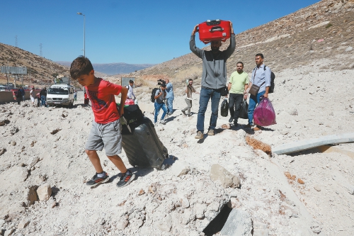 10月4日,在位于黎巴嫩与叙利亚边境的迈斯纳边境口岸附近,人们带着行李离开黎巴嫩境内。 (新华社发)