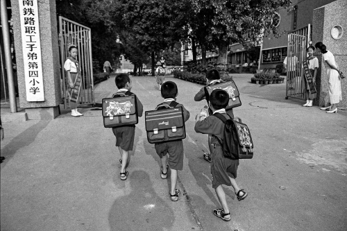 1999年9月1日,四胞胎背着新书包步入小学校门。