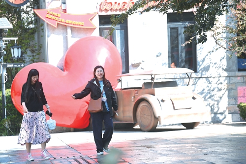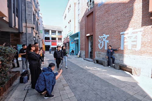 10月8日,国庆假期过后,游客打卡游玩济南老商埠的热情不减。老商埠的济南元素和浪漫元素吸引了众多年轻人结伴前来,集时尚和国潮于一体的老商埠商业街区节后依旧活力满满。 (王汗冰 摄)