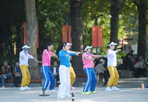 秋高气爽,正是开展运动健身的好时节,市民纷纷来到户外锻炼身体。近日,在济南森林公园,不少老年市民在玫瑰花语广场旁或跳起广场舞,或围坐在一起聊天、下象棋。10月天气渐凉,却挡不住人们外出健身的热情。(王汗冰 摄)
