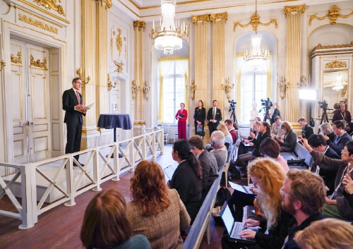 10月10日,瑞典文学院常任秘书马茨·马尔姆在斯德哥尔摩举行的新闻发布会上揭晓获奖者。 (新华社记者 彭子洋 摄)