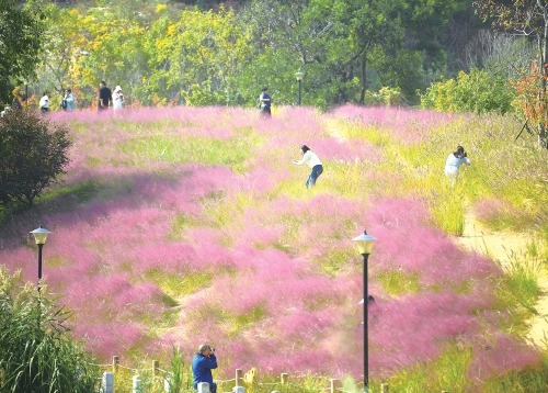 10月10日,济南龙洞风景区入口处的粉黛乱子草花海迎来最佳观赏期,市民纷纷打卡拍照,记录下秋日里的独特景致。时下正值粉黛乱子草盛开期,龙洞风景区入口处和经十路旁的泉城人才公园内,粉黛乱子草花海在周边景色衬托下,显得如梦如幻,浪漫的场景吸引了众多市民前来游玩。据了解,粉黛乱子草每年金秋时节开始盛放,会一直持续至11月中旬。成片种植可呈现出粉色云雾海洋的壮观景色。 (本报记者 崔健 摄)