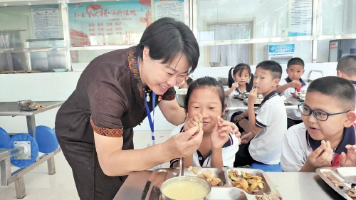 师生们在食堂品尝自己的劳动成果。