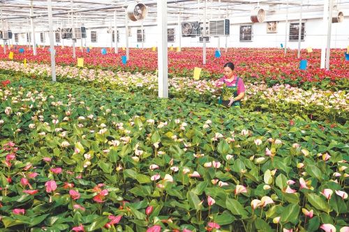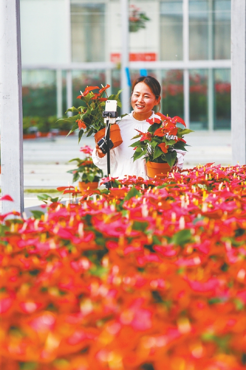 10月13日,位于商河县的乡村绿洲(山东)农业科技股份有限公司智能温室内,主播正在进行直播,向手机前的观众展示各类高品质花卉。在她的背后,工人们正忙着管护、采收、包装花卉。近年来,我市大力发展智慧农业,加快现代化农业发展,促进农民增收、农业增效,助力乡村振兴。(本报记者 赵晓明 通讯员 郝鑫城 摄)