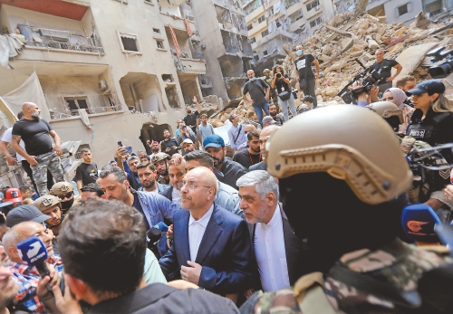 10月12日,伊朗议长穆罕默德-巴盖尔·加利巴夫(中左)到访黎巴嫩贝鲁特市中心最近遭以色列空袭的地点。(新华社发)