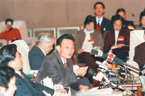 1994年3月,时任上海市委书记的吴邦国同志在全国两会上海代表团全团会议上。(新华社记者 刘建国 摄)