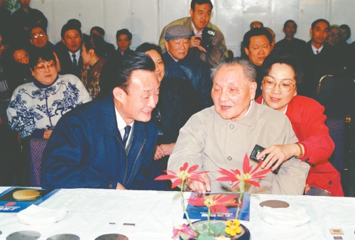 1992年2月10日,邓小平同志在上海贝岭微电子制造有限公司参观时与吴邦国同志交谈。 (新华社记者 柳中央 摄)