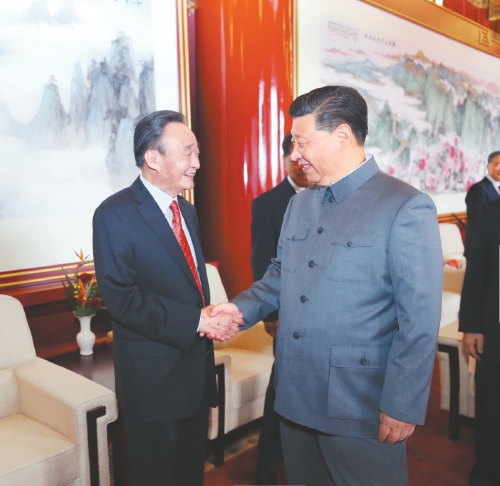 2021年7月1日,庆祝中国共产党成立100周年大会在北京天安门广场隆重举行。这是庆祝大会前,习近平同志与吴邦国同志握手。(新华社记者鞠鹏 摄)