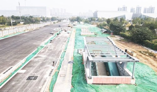 10月15日,在青岛路西首的济南轨道交通4号线小高庄站(工程名)施工现场,随着该站主体结构封顶后,现场地面重新铺设了沥青层。在青岛路两侧,地铁车站出入口正在建设中,上方的遮雨棚钢架结构已经呈现雏形。据了解,目前4号线全线33座车站已全部实现进场,其中28座车站实现主体结构封顶,5座车站处于主体结构施工阶段;全线现有10台盾构机正在掘进。(本报记者 崔健 摄)